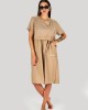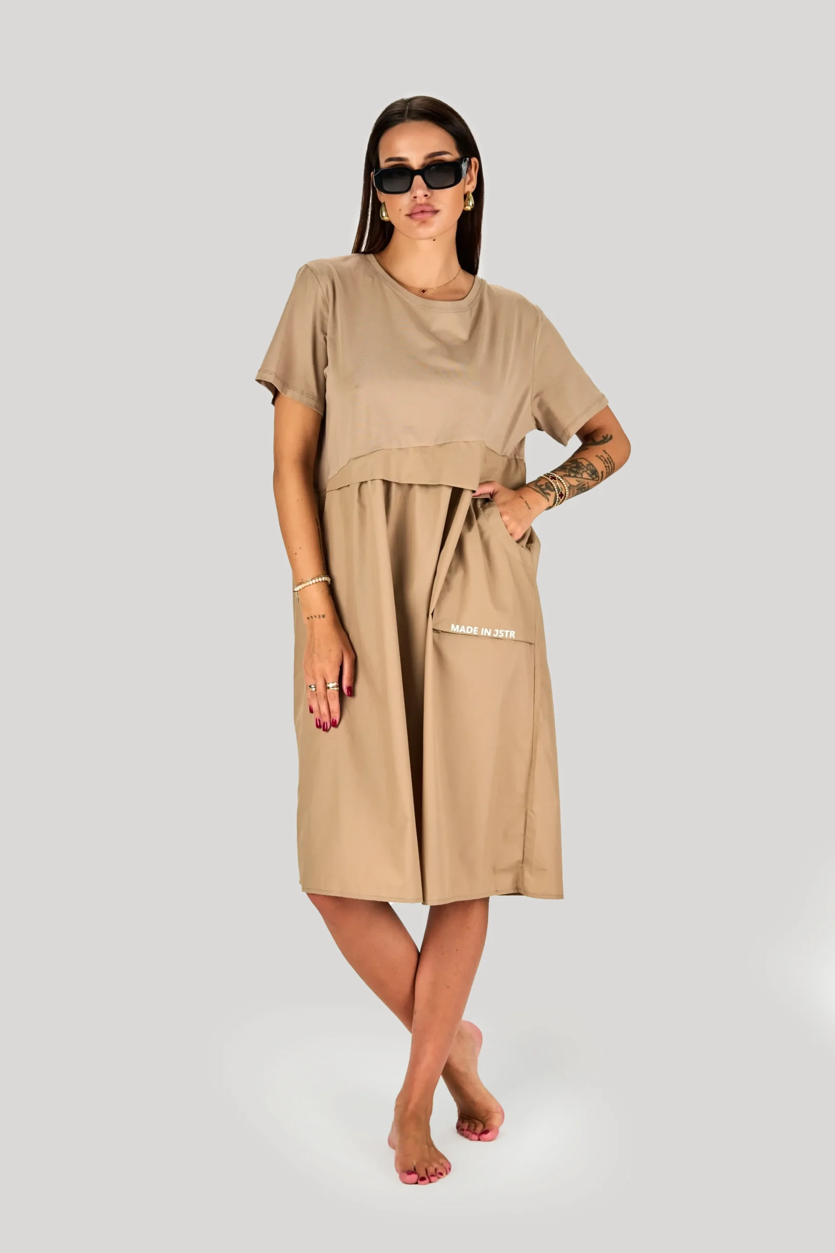 Obleka “Sproščena Poplin Eleganca” je izdelana iz kakovostnega bombažnega poplina, ki zagotavlja lahkotnost in zračnost. Obleka ima spredaj potisk z blagovno znamko, ki dodaja moderen in trendovski pridih. Zasnovana je s kratkimi rokavi in klasičnim okroglim izrezom, ki nudi udobje in vsestranskost. Ta obleka je popolna za vsakodnevno nošenje, sproščene izlete ali priložnostne dogodke, kjer želite združiti udobje z modnim izrazom.