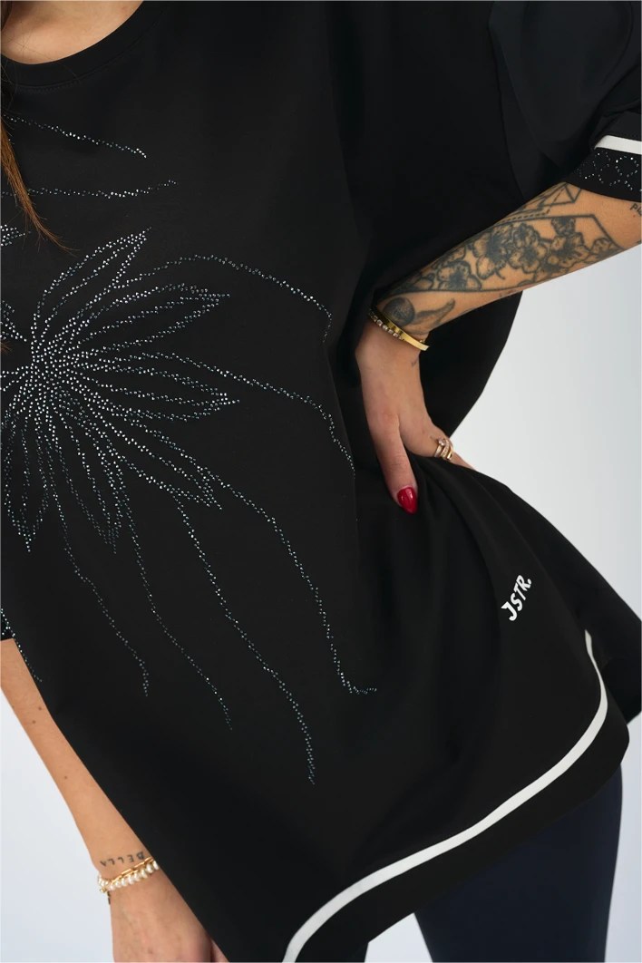 Ta daljša majica z motivom kamenčkov na sprednji strani je elegantna in udobna izbira za vsakodnevno nošenje. Izdelana iz posebej tkane vrste bombaža, ki zagotavlja mehkobo in kakovost, je majica prijetna na dotik in se lepo prilega telesu. Na robovih je okrašena z belo obrobo, kar dodaja svežino in stil. Krajši široki rokavi omogočajo svobodno gibanje ter dodajajo sproščen videz. S tem kosom boste izstopali, saj združuje edinstven motiv s preprosto eleganco, kar ga dela idealno izbiro za sproščene priložnosti.