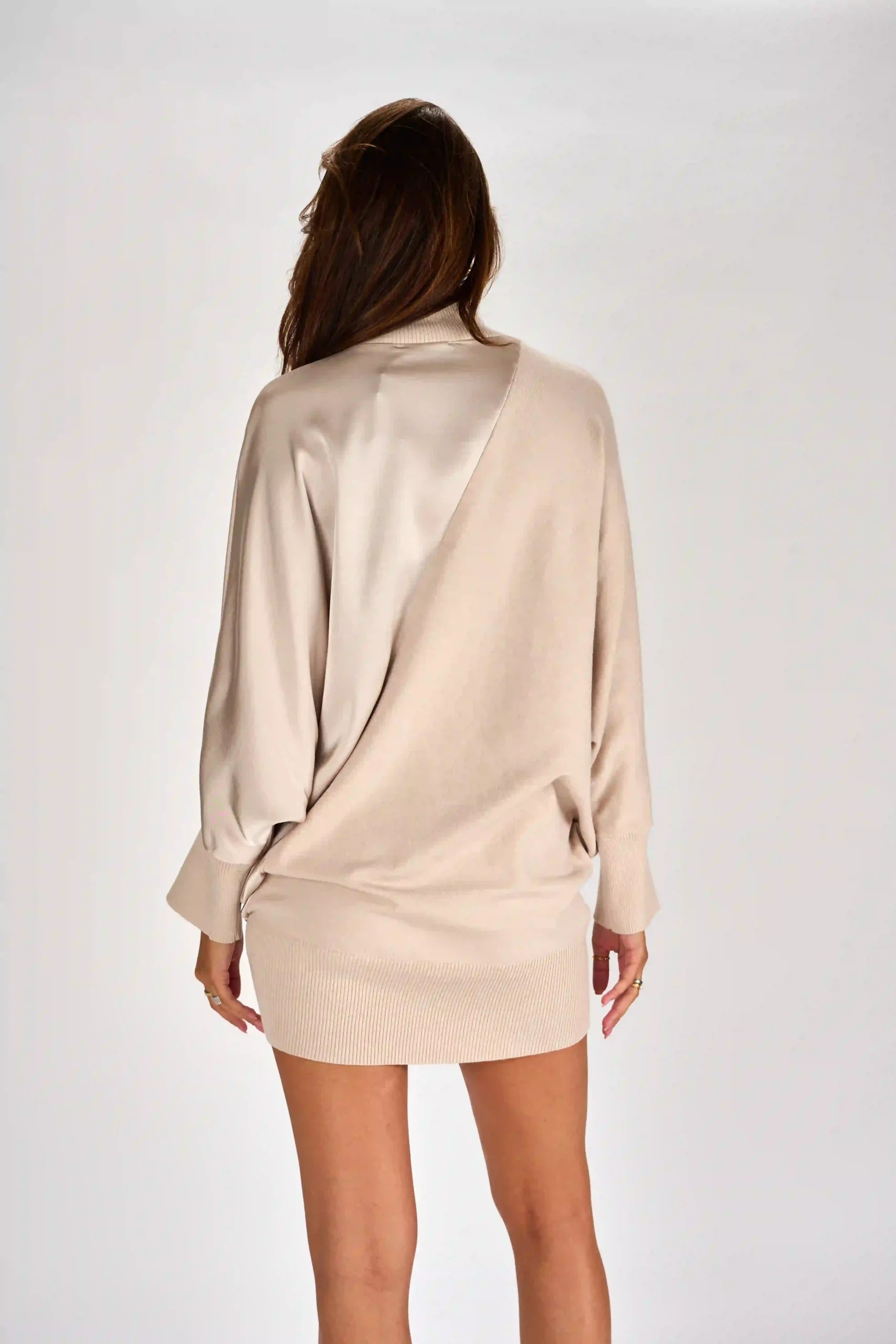 Pulover ima dolge netopirske rokave, ki prispevajo k sproščenemu in modnemu videzu. Satenasti detajli elegantno dopolnjujejo pletenino, dodajajo pridih luksuza in posebnega sijaja, ki izstopa v vsaki kombinaciji.