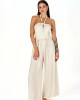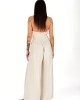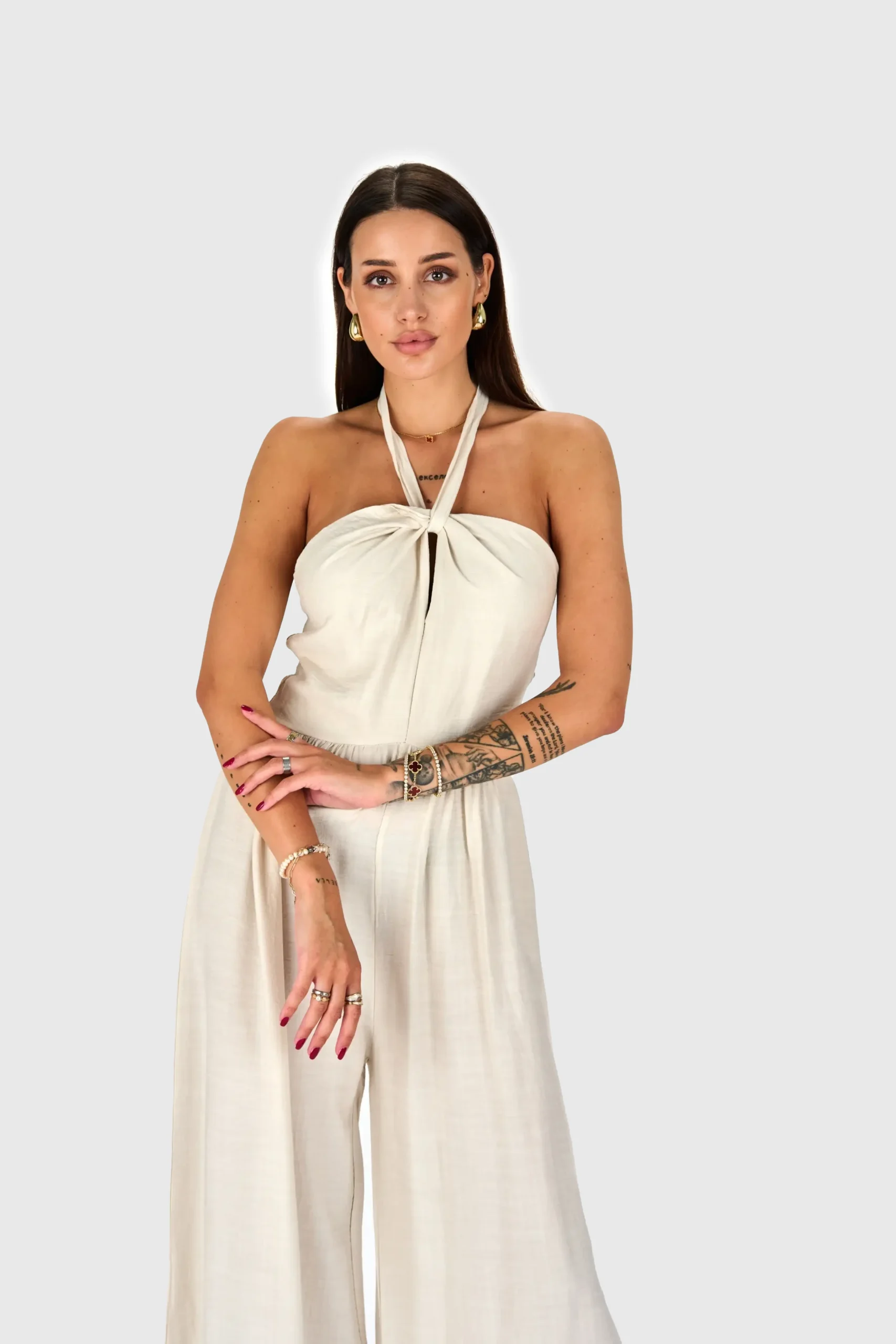 Dolg kombinezon iz lahkotne viskozne tkanine s širokimi hlačnicami in odprtim hrbtom za eleganten in sodoben videz.