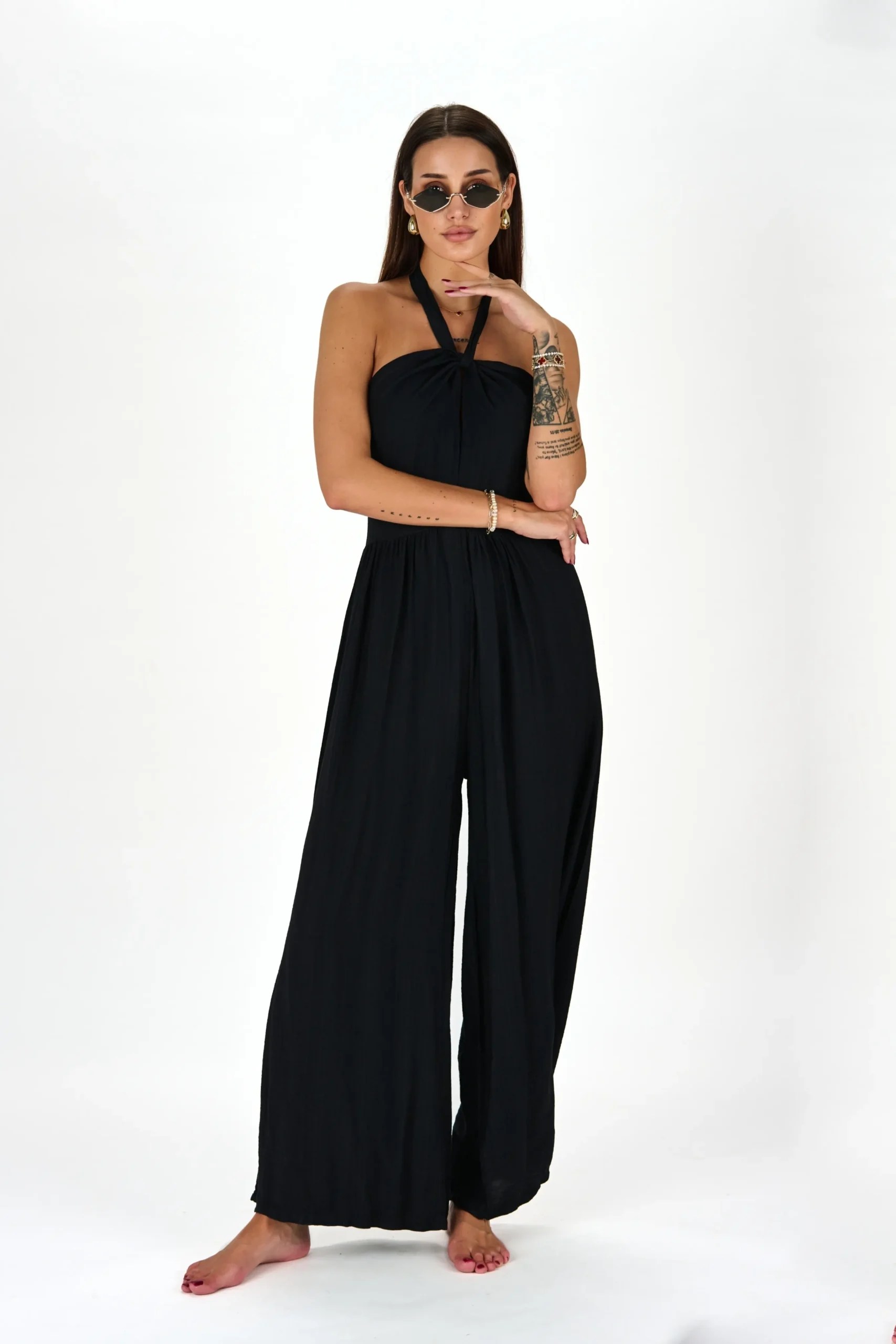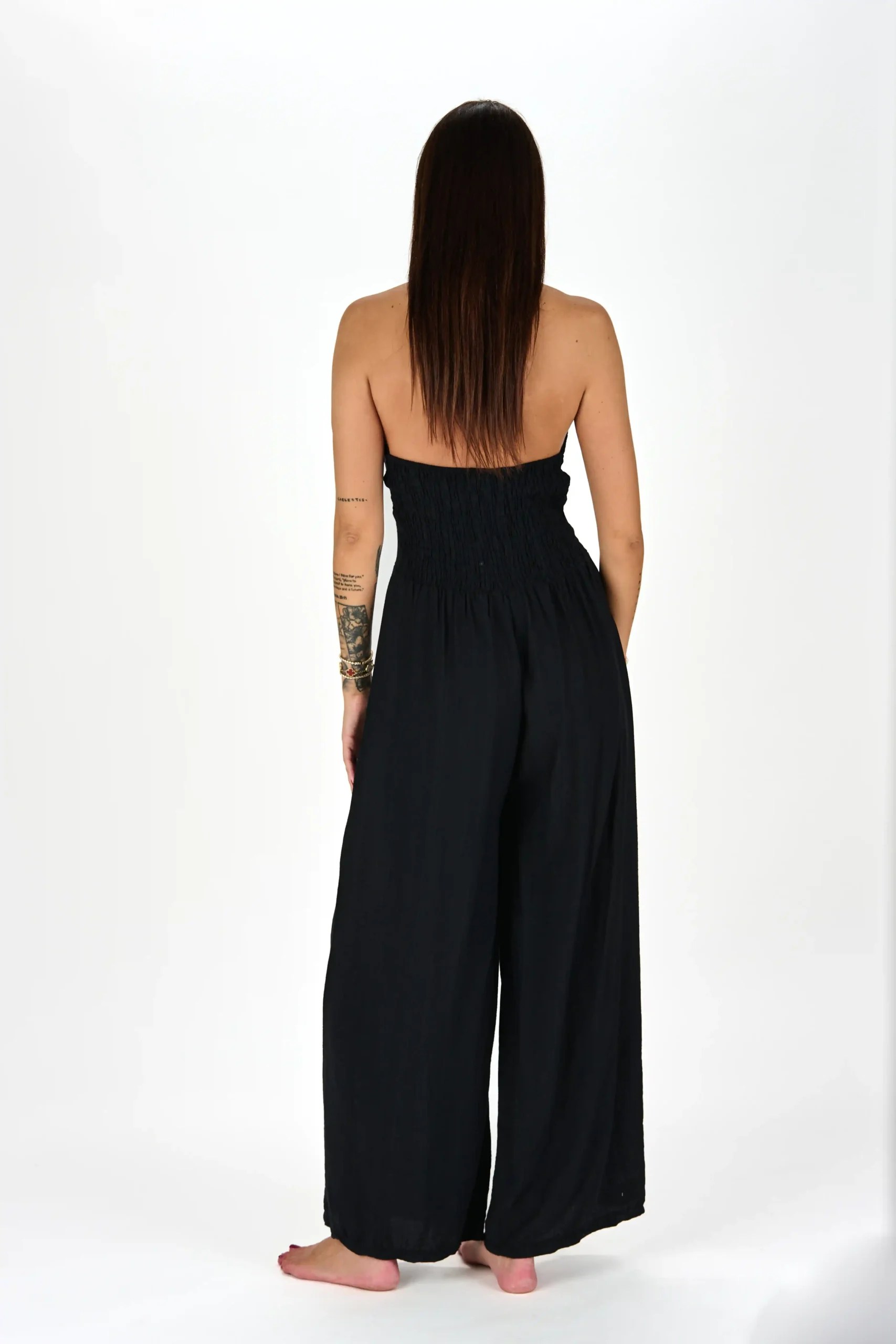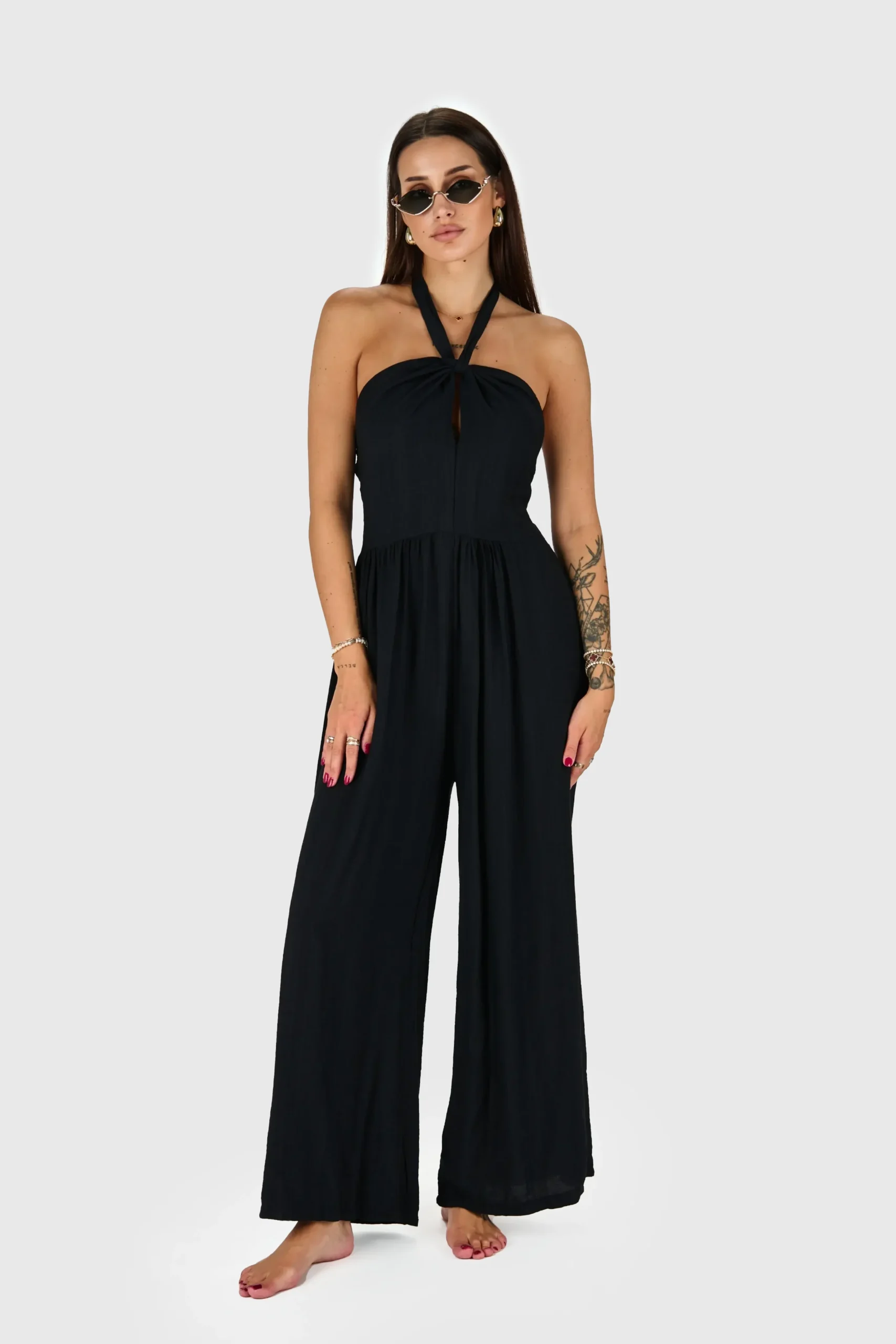 Dolg kombinezon iz lahkotne viskozne tkanine s širokimi hlačnicami in odprtim hrbtom za eleganten in sodoben videz.