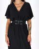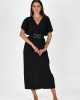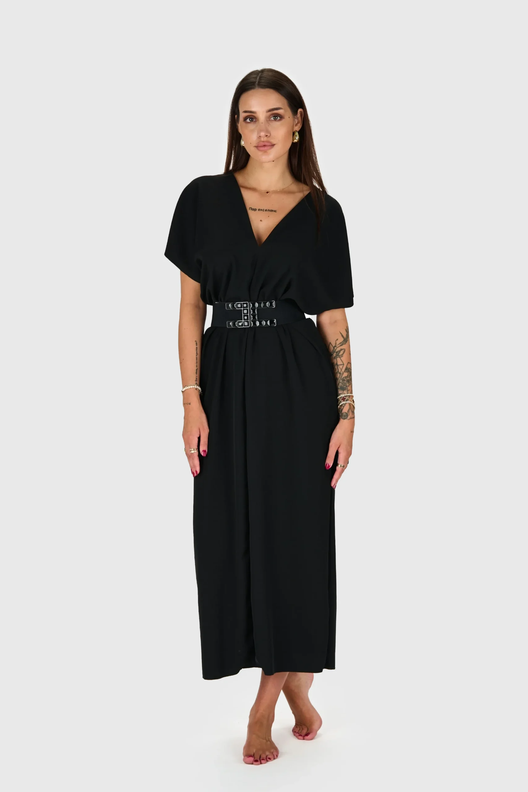 Dolga črna obleka iz lahkotne viskozne tkanine z V-izrezom spredaj in na hrbtu ter širšimi krajšimi rokavi za eleganten in prefinjen videz.