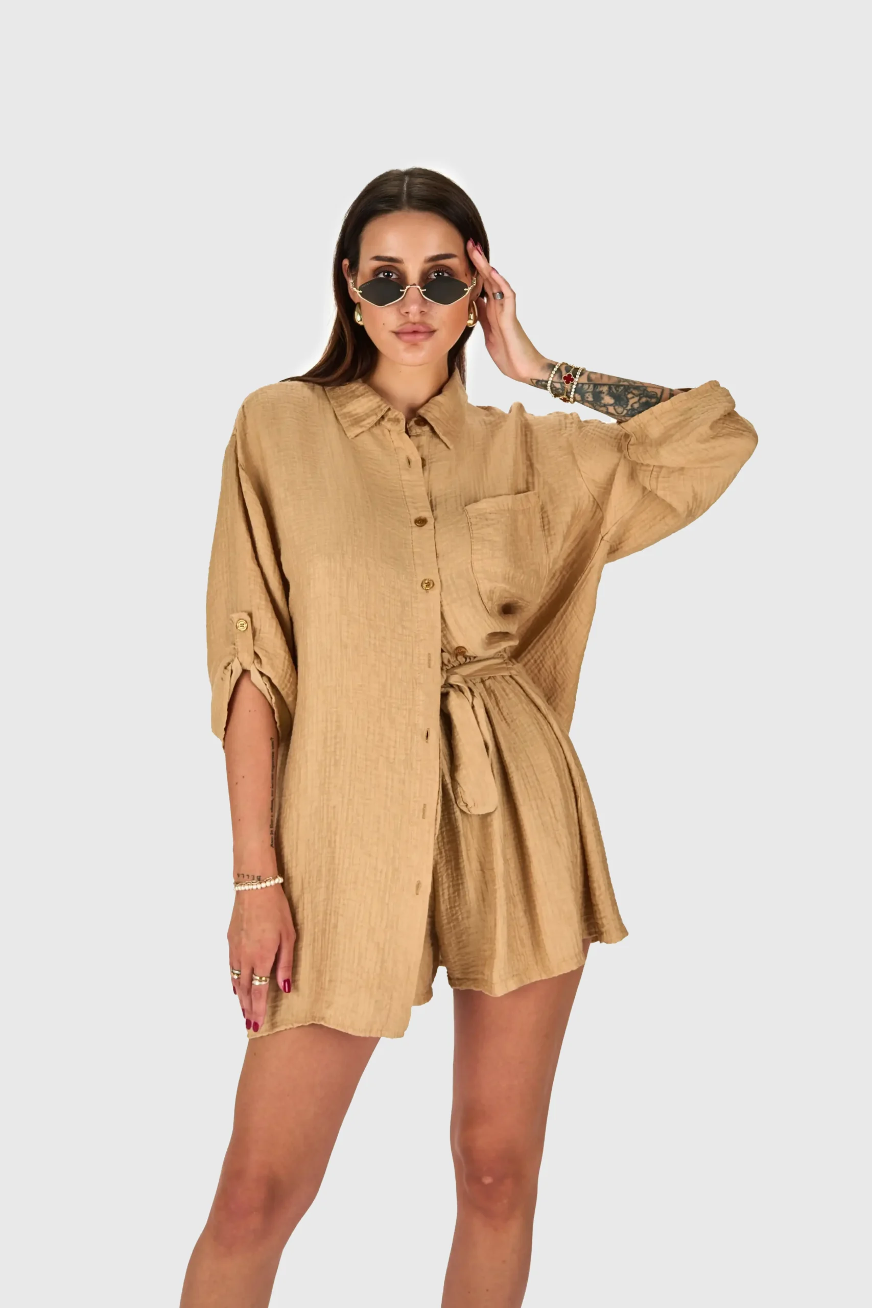Srajca “Elegantna Sproščenost” je popolna za tiste, ki cenijo brezčasno eleganco z modernim pridihom. Izdelana je iz kakovostne tkanine, ki zagotavlja udobje in prefinjen videz. Dolga in široka zasnova omogoča sproščen in zračen fit, idealen za plastenje ali samostojno nošenje. Visok ovratnik dodaja sofisticiranost in izstopa kot modni detajl. Sprednje zapenjanje na gumbe omogoča prilagodljivost in funkcionalnost, hkrati pa dodaja klasičen šarm. Ta srajca je kot nalašč za poslovne priložnosti, večerne izhode ali sproščene dni, kjer želite izražati svoj edinstven stil.