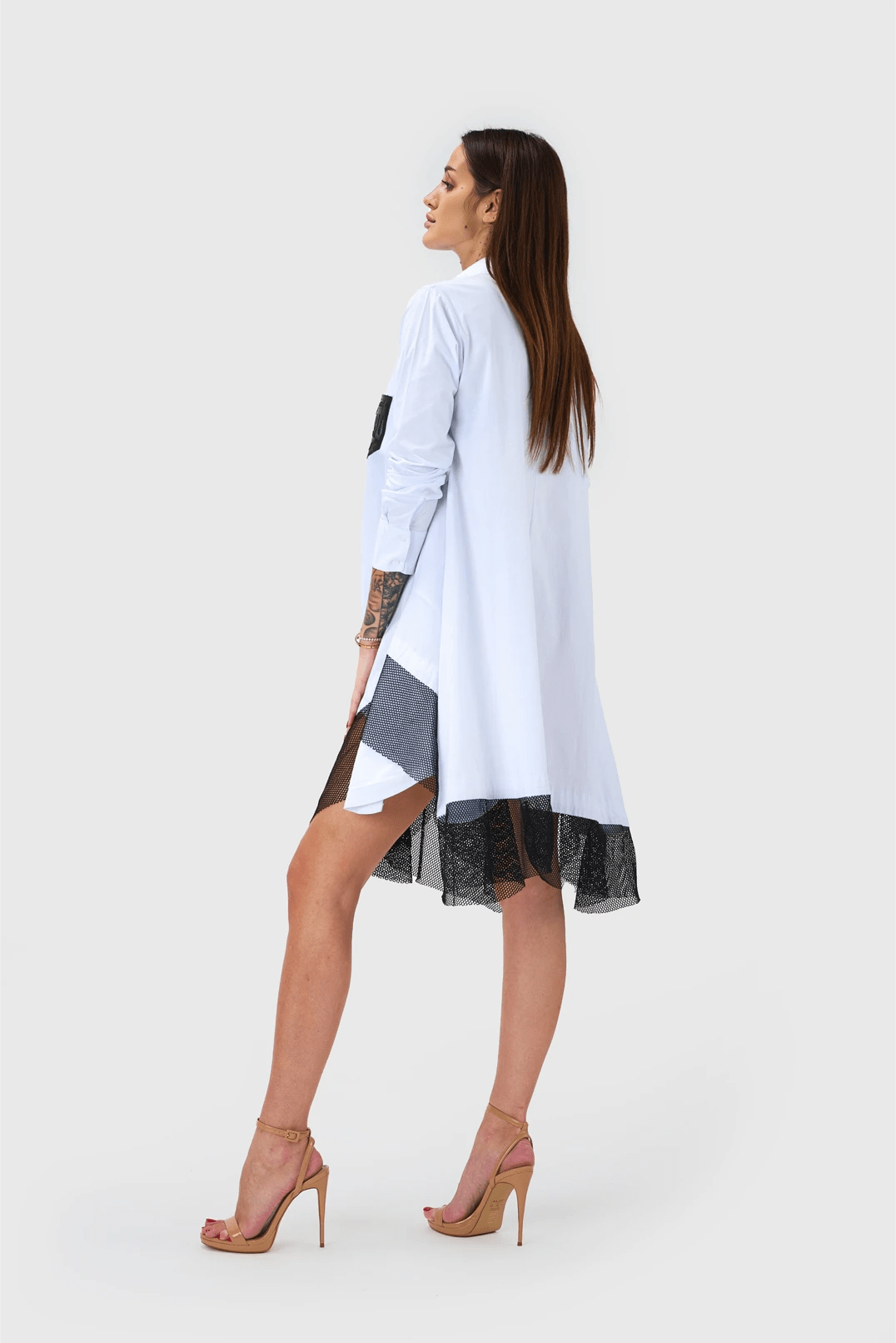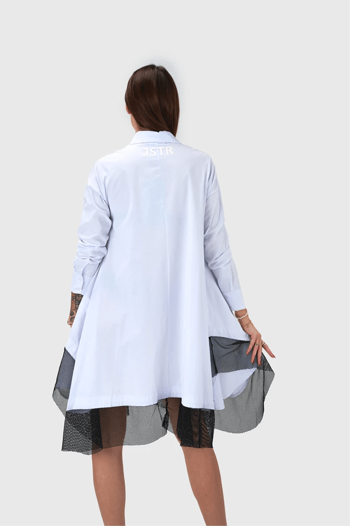 Dolga srajčna obleka “Moderna Klasčnost” je izdelana iz mehke bombažne tkanine, ki zagotavlja udobje in zračnost. Obleka se ponaša s sprednjim zapenjanjem na gumbe, kar dodaja klasičen pridih. Spodnji del obleke je obogaten z mrežico, ki prinaša zanimiv vizualni kontrast in dinamiko. Na straneh so skrivno všita žepa, ki omogočajo praktičnost, medtem ko spredaj detajlni žep doda dodatno eleganco. Ta obleka je odlična izbira za vsakodnevne priložnosti ali sproščene izhode, saj združuje udobje, stil in funkcionalnost.