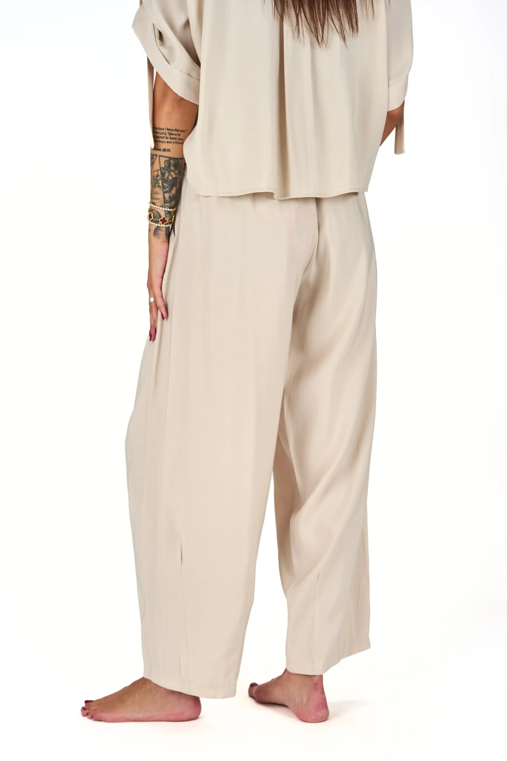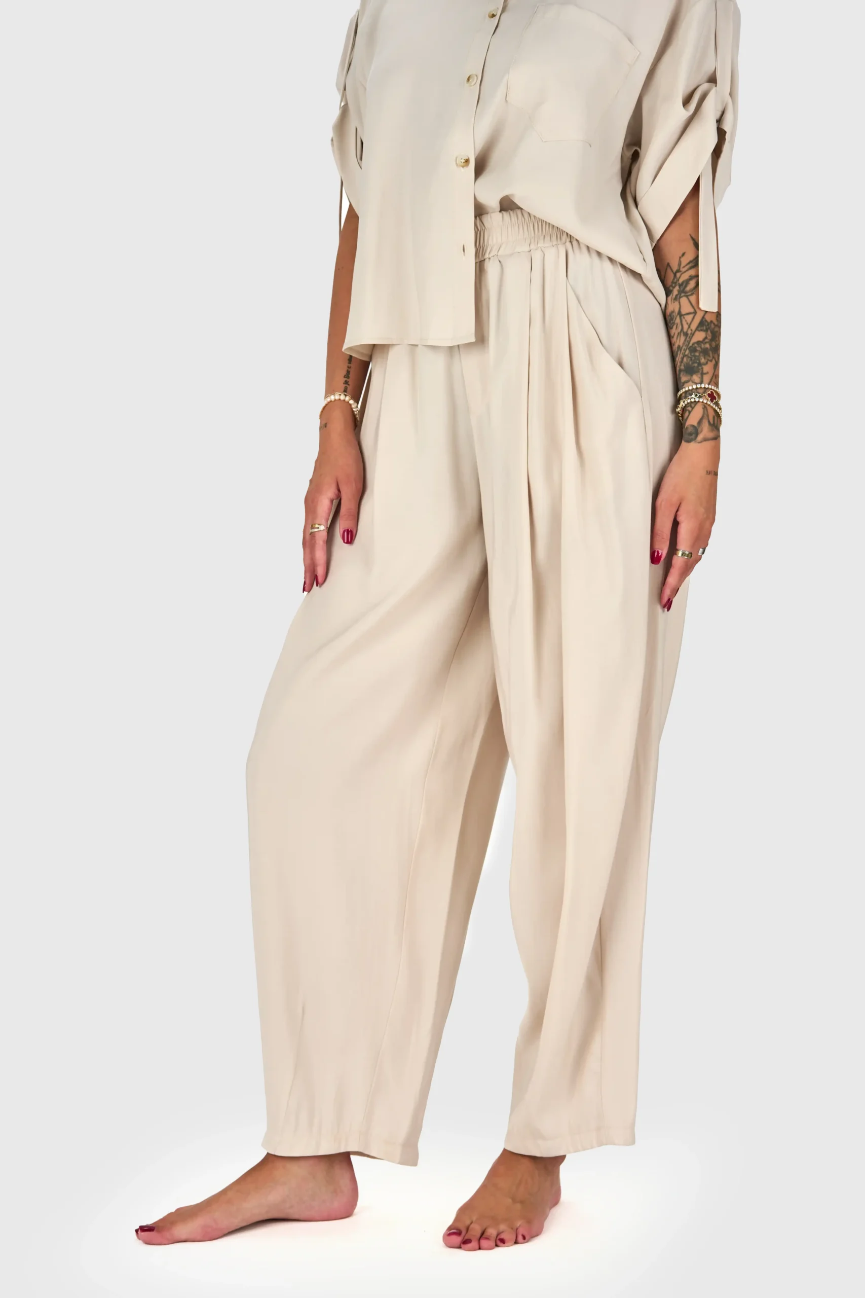 Dolge hlače z širokimi hlačnicami, sprednjimi naborki, elastičnim pasom in stranskima žepoma za sodoben in udoben videz.