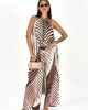 Hlače “Sproščena Eleganca” so zasnovane za tiste, ki želijo združiti stil in udobje. Izdelane iz lahkotne viskozne tkanine, te hlače ponujajo zračnost in prijeten občutek na koži, kar je idealno za tople dni. Dolge in široke hlačnice ustvarjajo eleganten in tekoč videz, ki se lepo giblje z vsakim vašim korakom. Vzorec peresa dodaja edinstven in umetniški pridih, ki hlače dvigne na novo raven stila. Elastičen pas zagotavlja prilagodljivo in udobno prileganje, medtem ko stranski žepi dodajajo praktičnost. Te hlače so popolne za sproščene poletne sprehode ali elegantne večerne izhode.