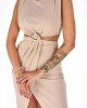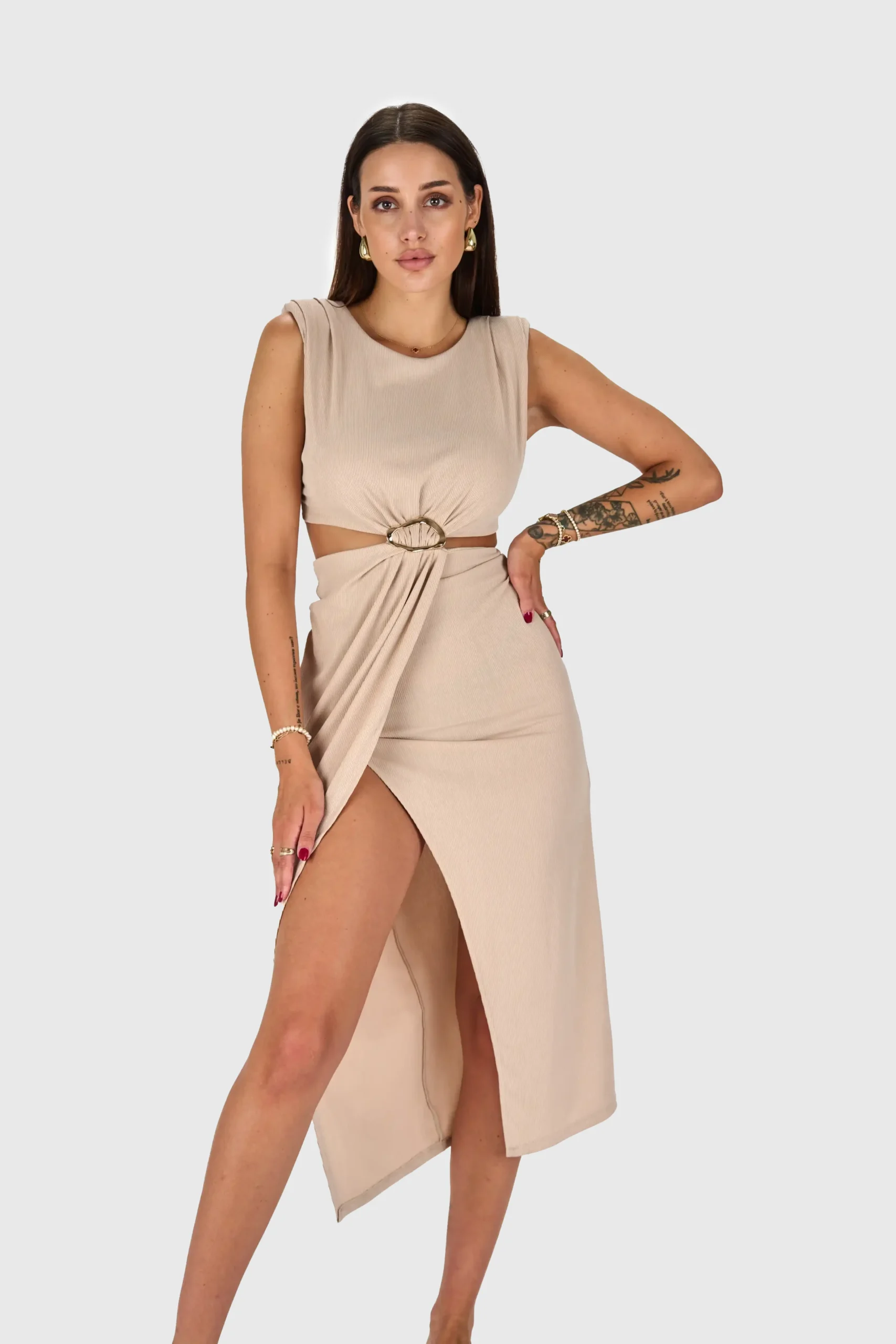Obleka iz strukturirane bombažne tkanine z razrezi spodaj in na straneh, zlatim detajlom spredaj ter podloženimi rameni za prefinjen in sodoben videz.