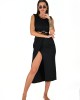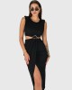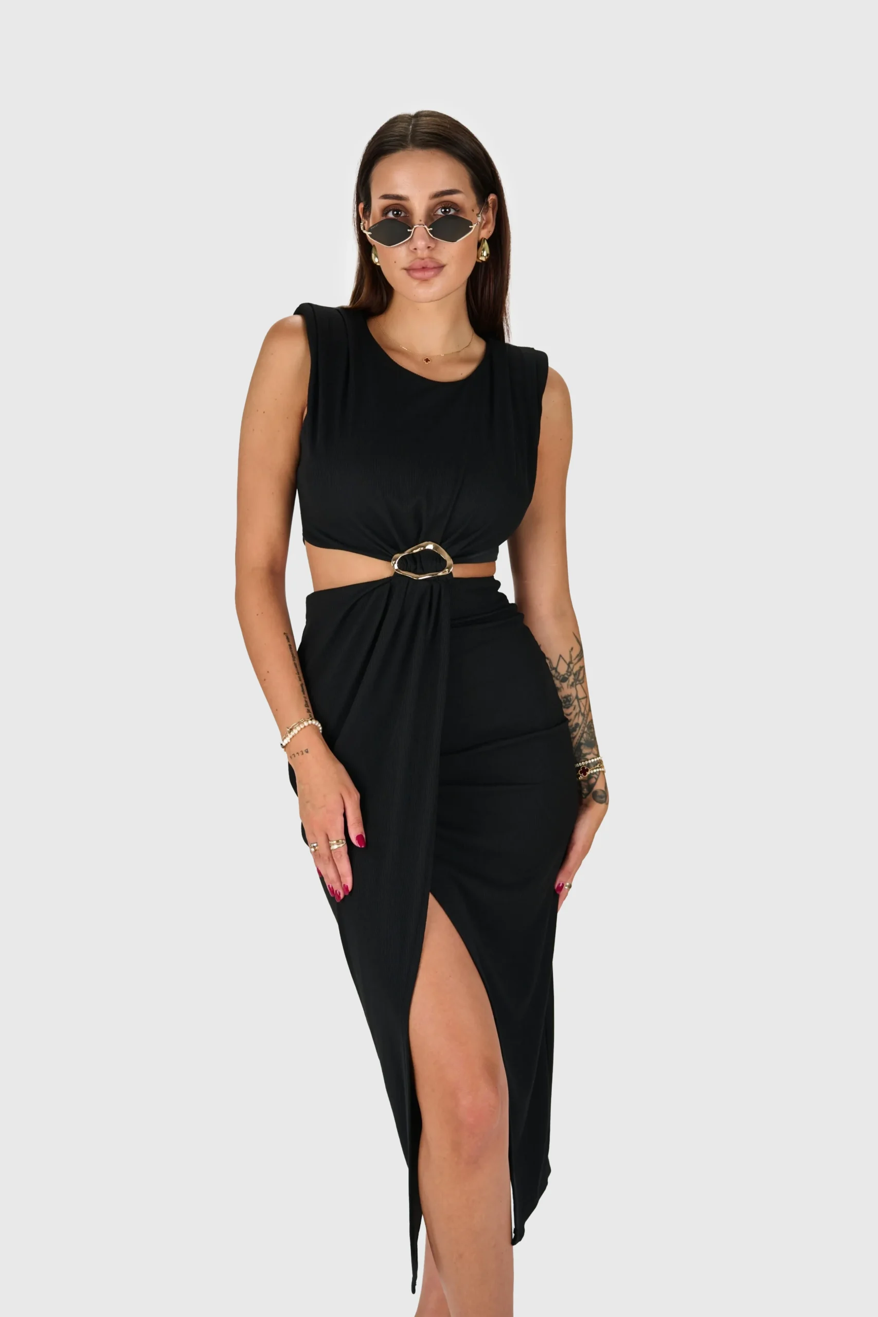 Obleka iz strukturirane bombažne tkanine z razrezi spodaj in na straneh, zlatim detajlom spredaj ter podloženimi rameni za prefinjen in sodoben videz.