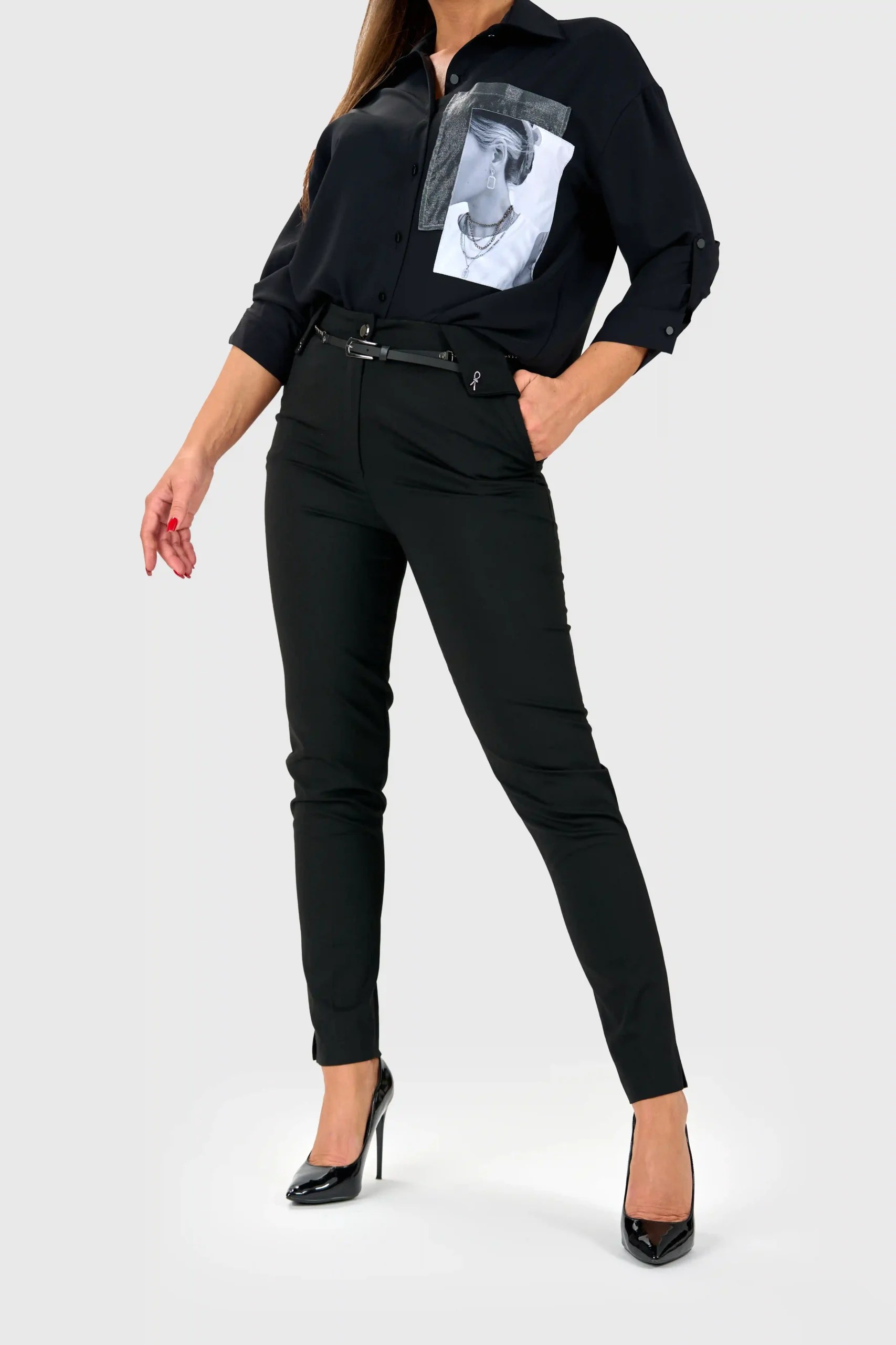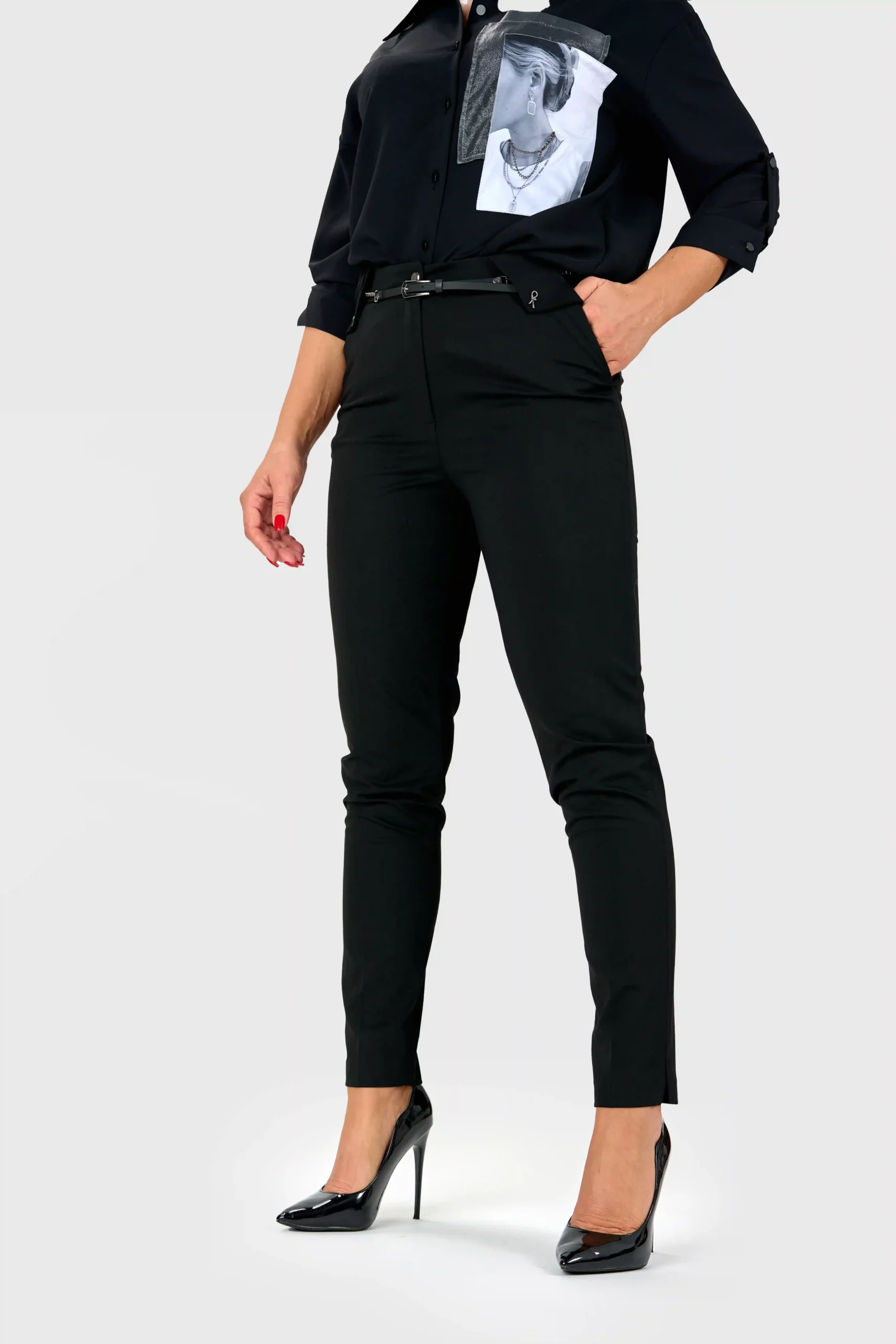Ožje raztegljive hlače iz mehkega drapiranega bombaža so popolna kombinacija elegance in udobja. S sprednjim detajlnim zavihkom in pasom iz umetnega usnja te hlače dodajo poseben pridih sodobnega sloga. Zasnovane so tako, da se ne mečkajo, kar zagotavlja brezhiben videz skozi ves dan, ne glede na priložnost. Hlače se nežno prilegajo telesu in ustvarjajo čudovit padec, ki poudari vašo postavo. Idealne so za poslovna srečanja ali sproščene večerne dogodke, saj vam omogočajo, da izgledate in se počutite odlično v vsakem trenutku.