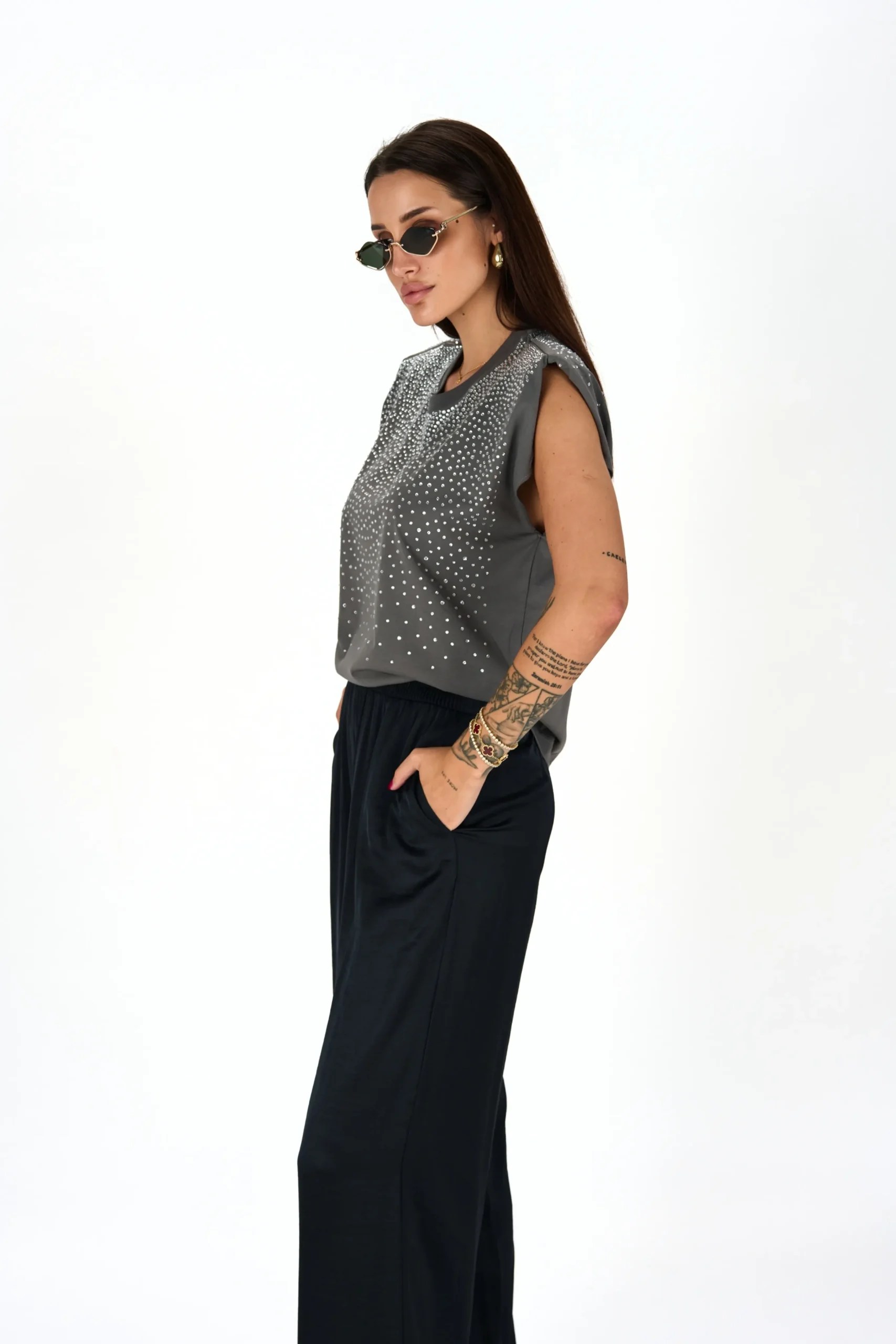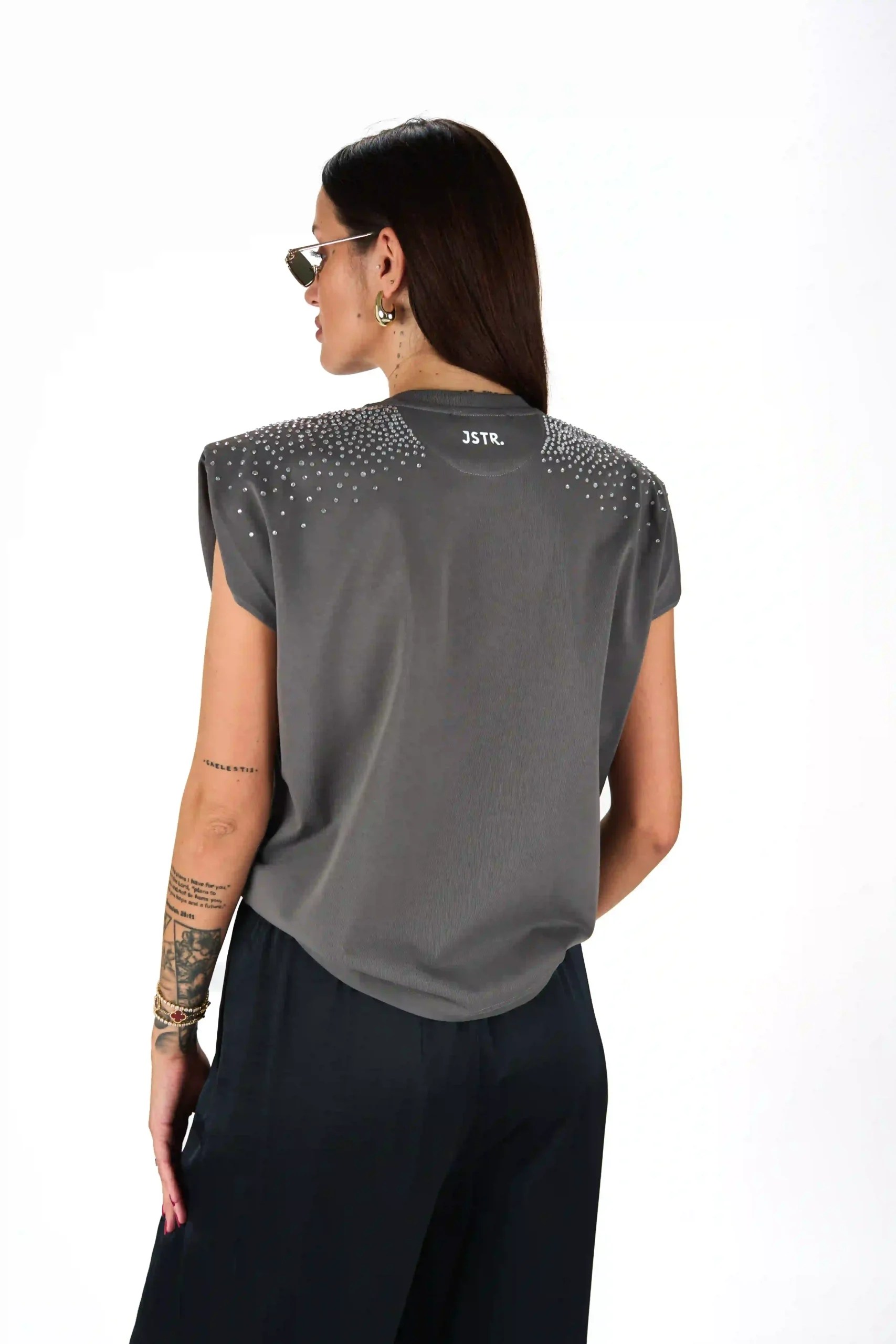 Majica “Elegantna Drznost” iz kolekcije JSTR prinaša edinstveno kombinacijo elegance in modernosti. Ta majica brez rokavov je oblikovana z podloženimi rameni, ki dodajo strukturo in prefinjenost, kar ustvarja čiste linije in sofisticiran videz. Po celotni površini majice so diskretno razporejeni kamenčki, ki dodajajo subtilen sijaj in modni detajl. Na hrbtni strani je potisk blagovne znamke JSTR, kar dodaja prepoznaven modni podpis. Ta majica je idealna za večerne priložnosti, posebne dogodke ali kadar želite dodati kanček glamurja svoji vsakodnevni garderobi.