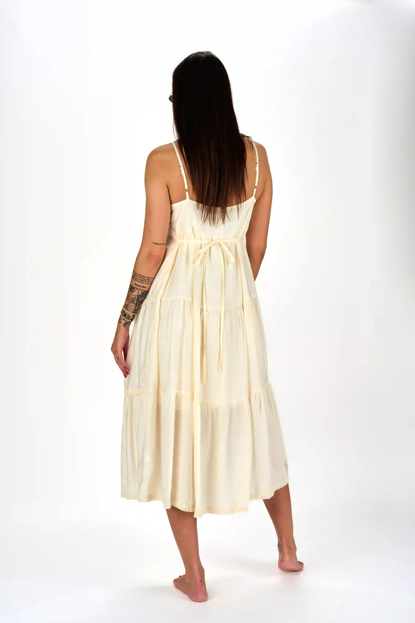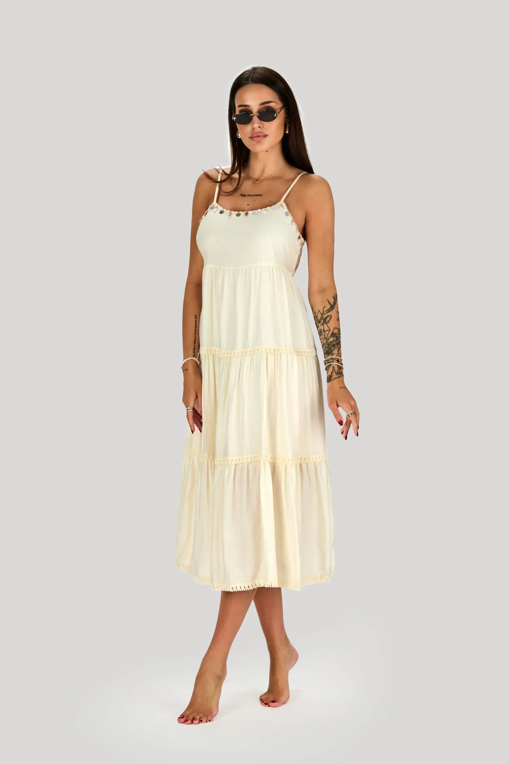 Obleka “Svetleča Svilnata Eleganca” je popolna kombinacija razkošja in udobja, izdelana iz mešanice viskoze in svile, ki zagotavlja čudovit padec in prijeten občutek na koži. Obleka je zasnovana z naramnicami, spredaj pa je okrašena z všitimi bleščečimi krogci, ki dodajo kanček glamurja in privlačnosti. Hrbtna nastavljiva vrvica omogoča prilagodljivo prileganje, poudarja hrbtni del in dodaja eleganco. Ta obleka je idealna za svečane dogodke, večerne izlete ali posebne priložnosti, kjer želite biti v središču pozornosti.