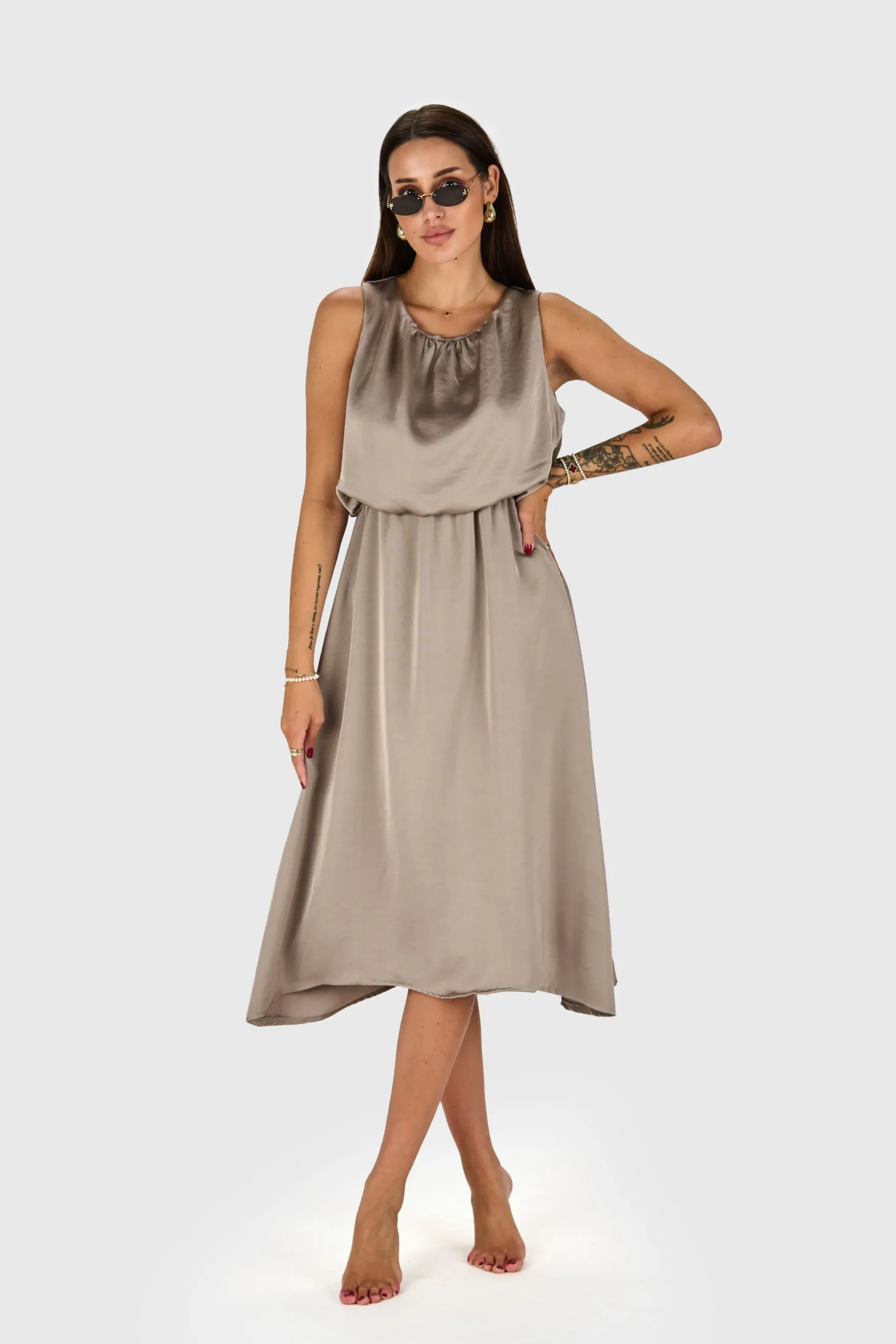 Lahkotna obleka iz viskoze brez rokavov z okroglim izrezom in elastiko na sredini za sproščen in eleganten videz.
