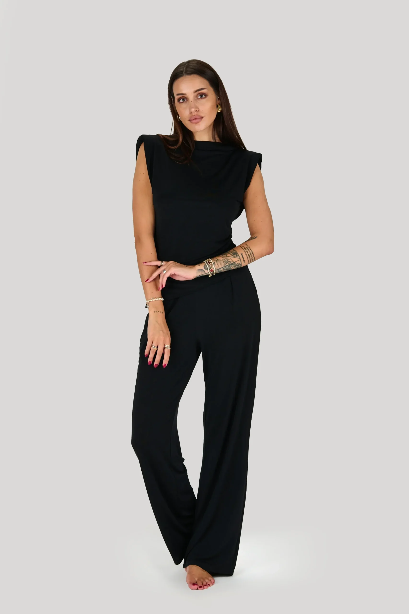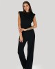 Majica brez rokavov iz lahkotnega viskoznega materiala s podloženimi rameni za elegantno in udobno poletno nošenje.