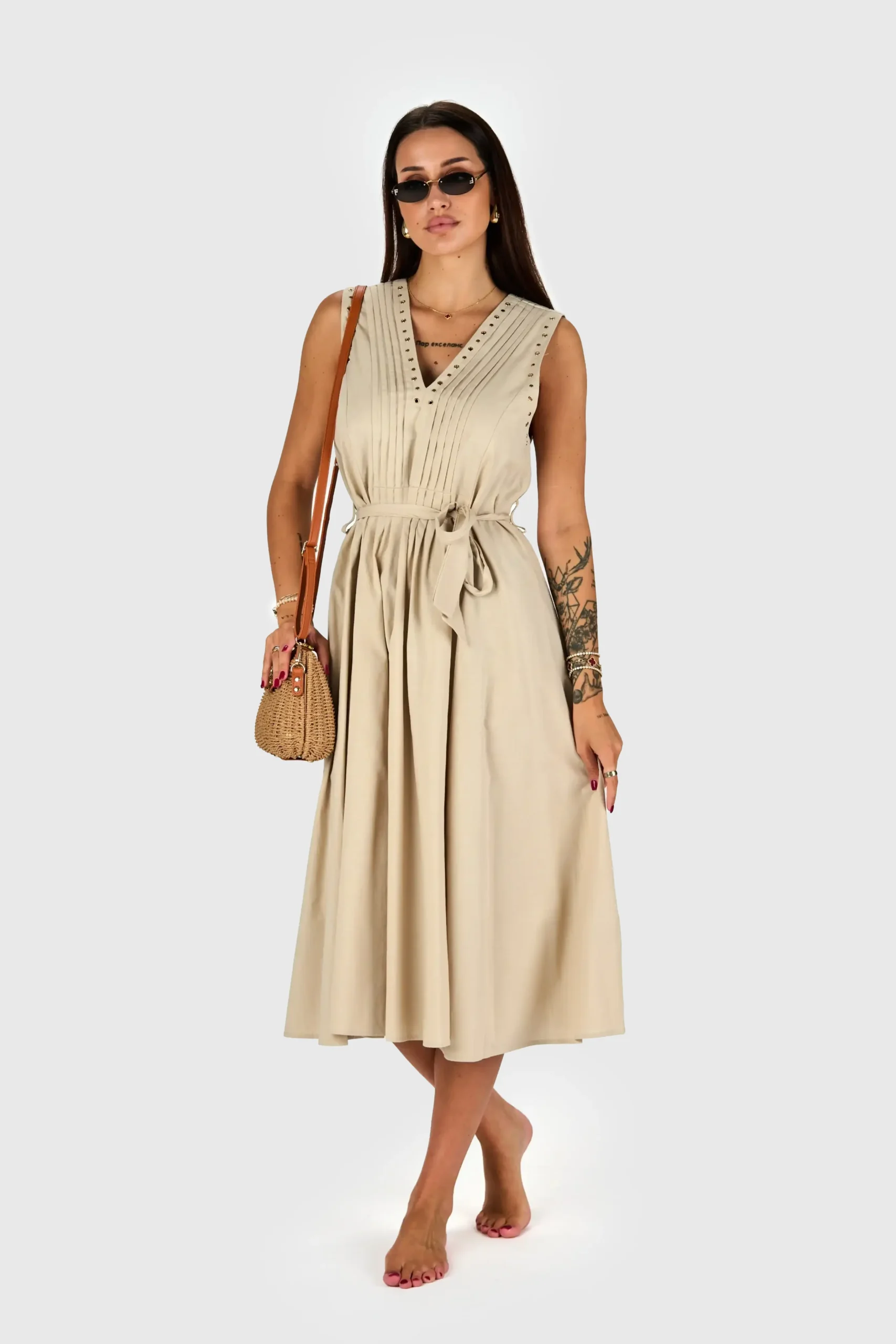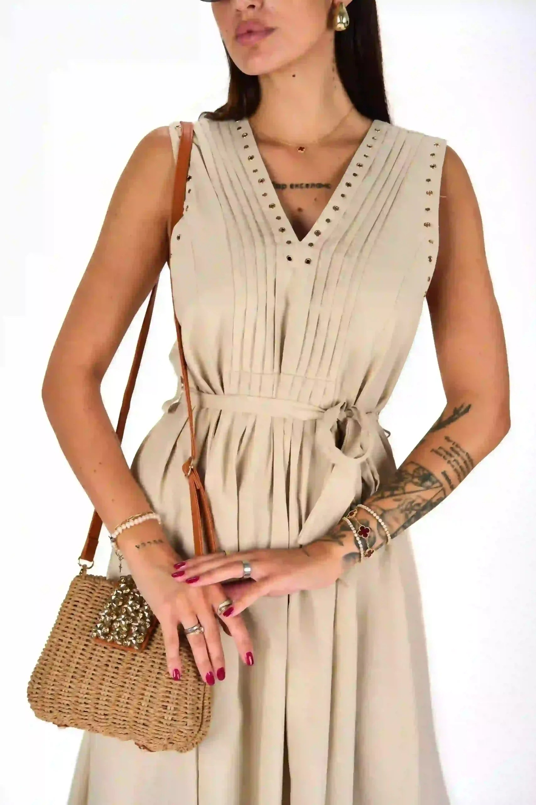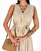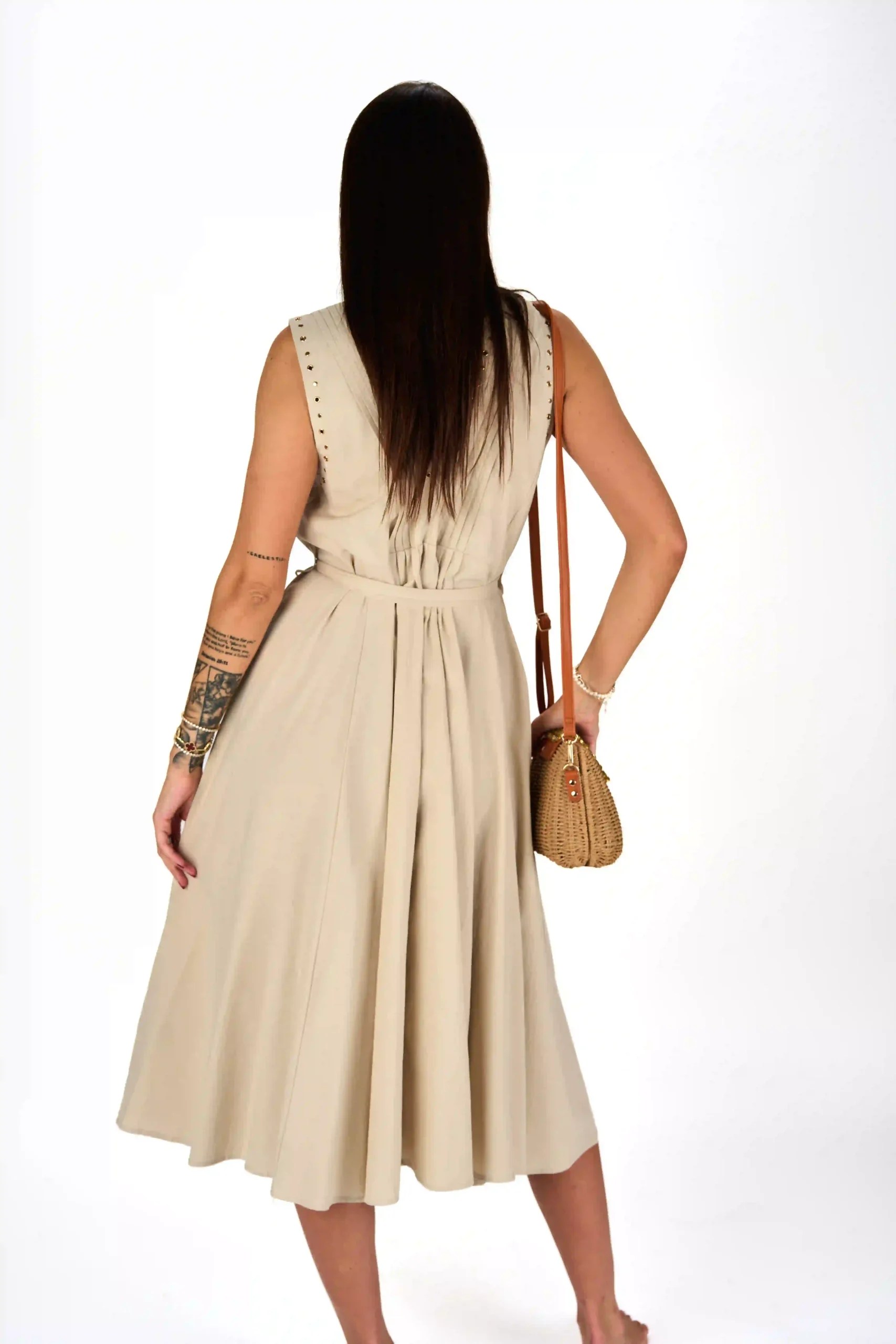Obleka “Eleganca z Zlatim Pridihom” je izdelana iz nekoliko trše bombažne tkanine, ki zagotavlja strukturo in lepo obliko, medtem ko ohranja udobje in zračnost. Sprednji del obleke krasijo eleganten V-izrez, ki poudari dekolte in doda prefinjenost. Okoli ovratnika so skrbno nameščeni zlati krogci, ki prinašajo eleganten in luksuzen pridih. Pas na obleki omogoča prilagoditev in poudarja vašo silhueto, kar ustvarja ženstveno in uravnoteženo linijo. Ta obleka je idealna za posebne priložnosti, poslovne dogodke ali večerne izhode, kjer želite izstopati z brezčasno eleganco.