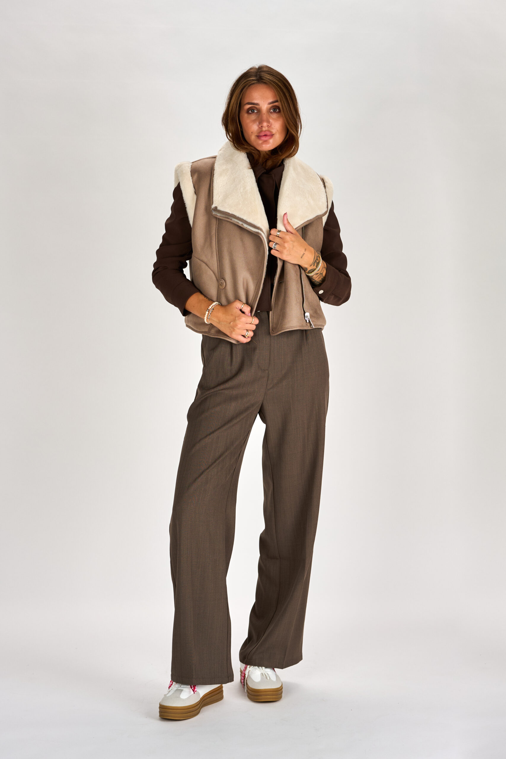 Obložen kratek brezrokavnik iz kolekcije JSTR je popoln za tiste, ki želijo dodati moderni pridih svoji garderobi. Ta brezrokavnik je kombiniran z imitacijo usnja, kar mu daje sofisticiran videz in dodatno teksturo. Njegova obojestranska zasnova vam omogoča, da ga nosite na dva različna načina, kar povečuje njegovo vsestranskost.
