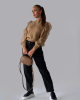 Pulover iz oblačilno barvane mešanice z recikliranimi vlakni in tkanim vzorcem. Oblačilo zaznamujejo volančki.