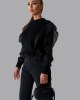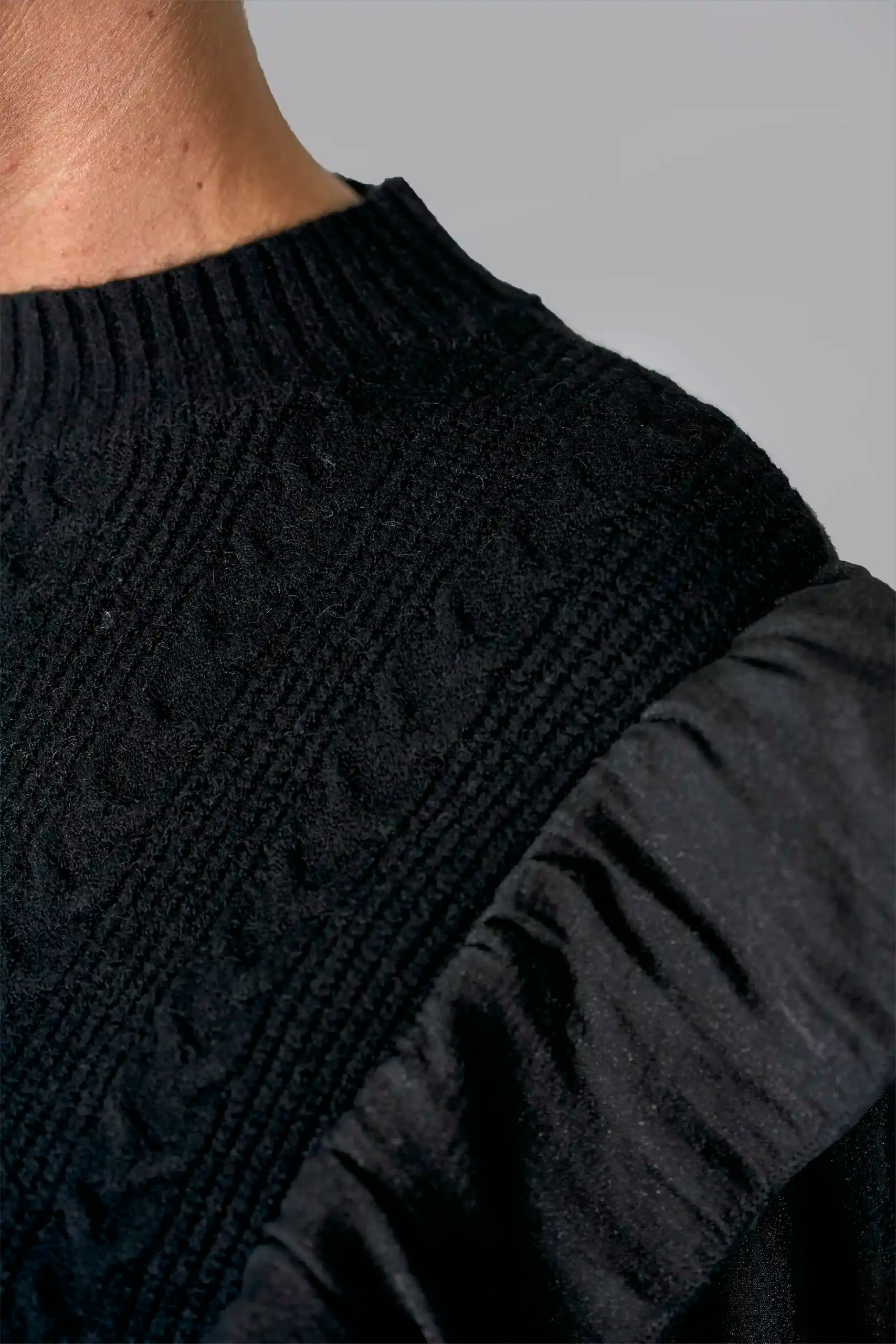 Pulover iz oblačilno barvane mešanice z recikliranimi vlakni in tkanim vzorcem. Oblačilo zaznamujejo volančki.