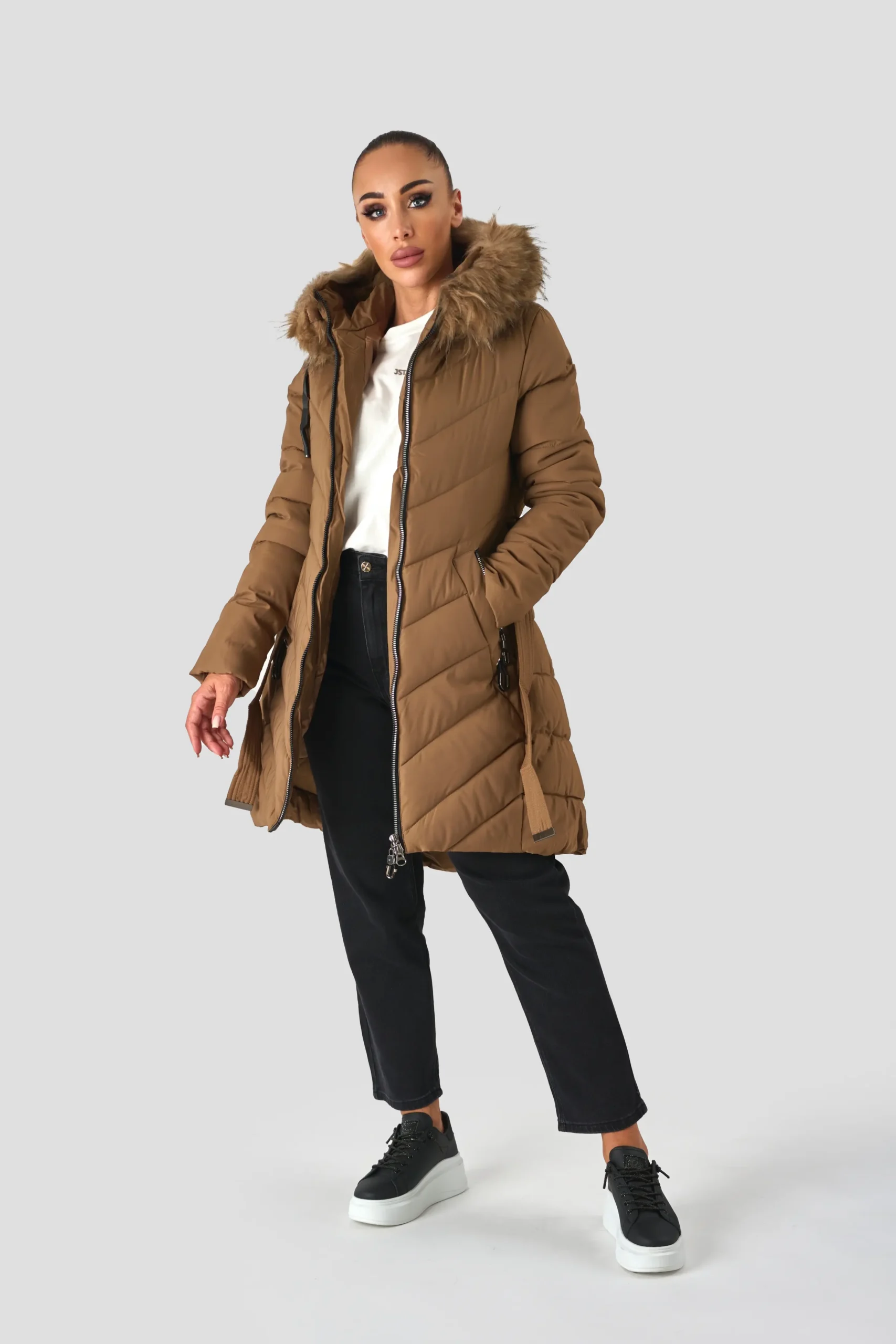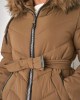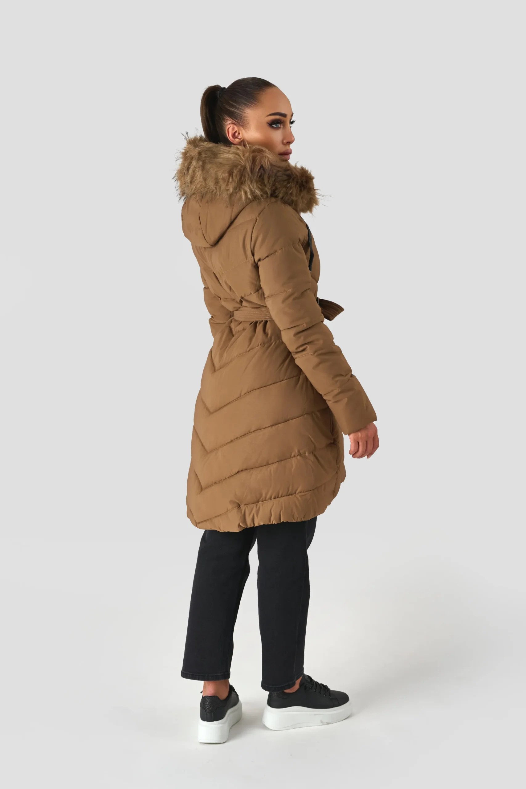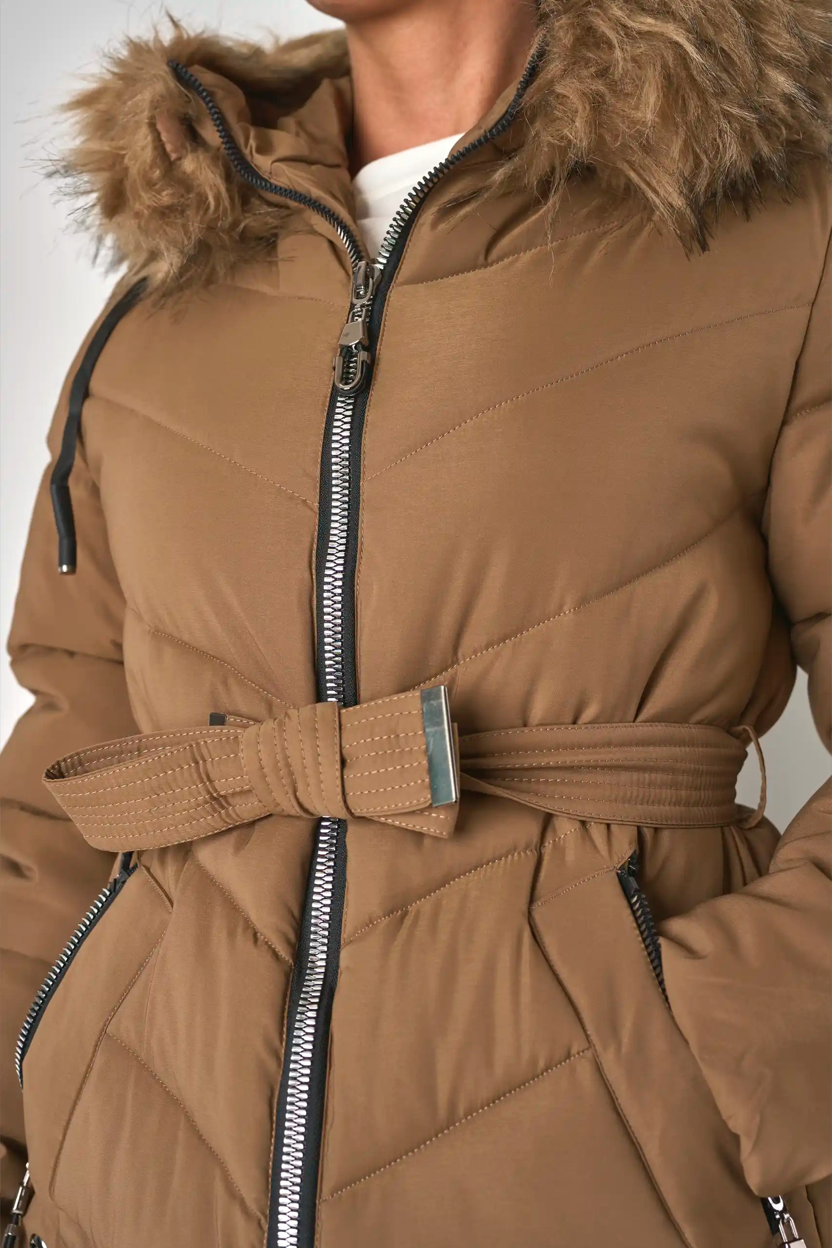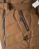 Srednje dolg plašč z matiranim zaključkom in prešitim vzorcem. Oblačilo se odlikuje po udobnem in teliranem kroju. Zaradi trdnega notranjega oblazinjenja je idealen tudi v najhladnejših dneh. Artikel oplemeniti velika kapuca z umetnim krznom.