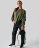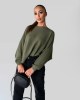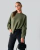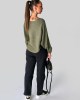 Pulover iz oblačilno barvane mešanice z recikliranimi vlakni in tkanim črtastim vzorcem. Oblačilo zaznamujejo široki rokavi.