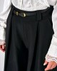 Hlače z visokim pasom z zankami in naborki. Oversized oblačilo je izdelano iz enobarvnega ra. Artikel je poudarjen z naborki ter z elastičnim pasom.