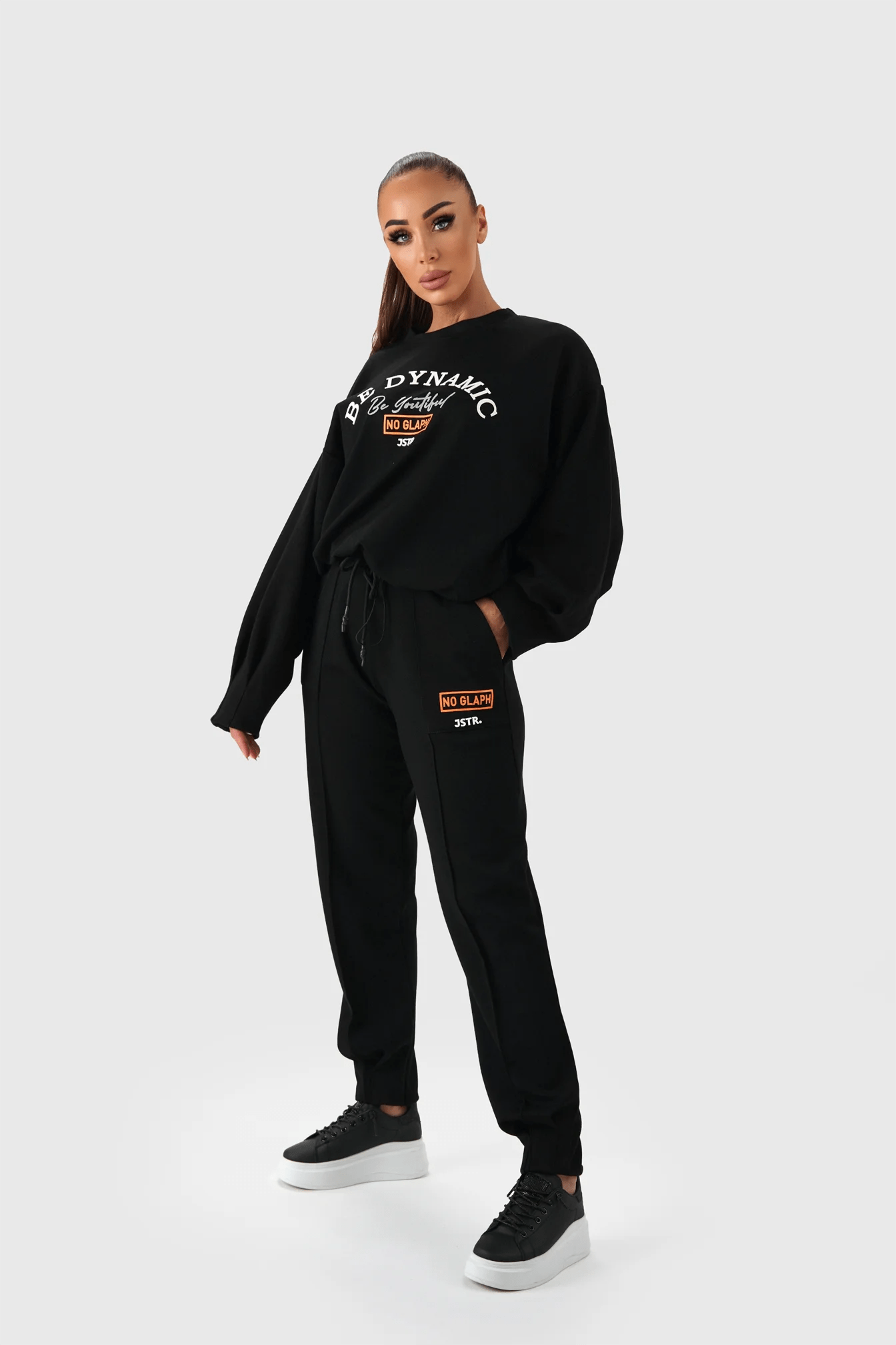 Široke hlače z elastičnim pasom, nastavljivo vrvico in stranskima žepoma za udoben in sproščen videz.