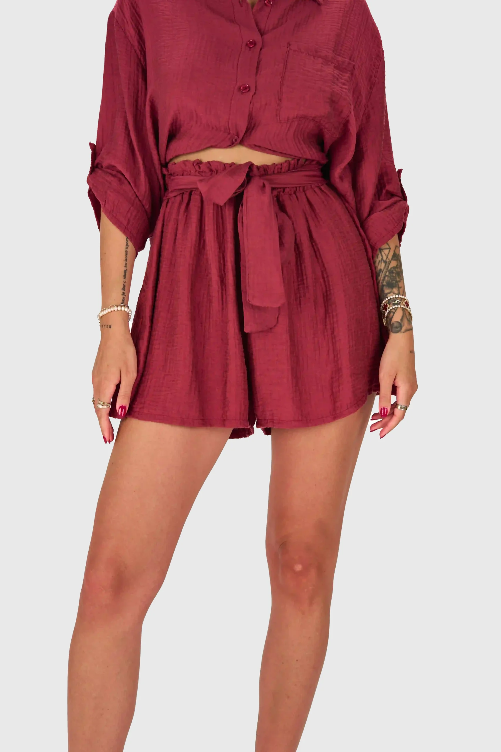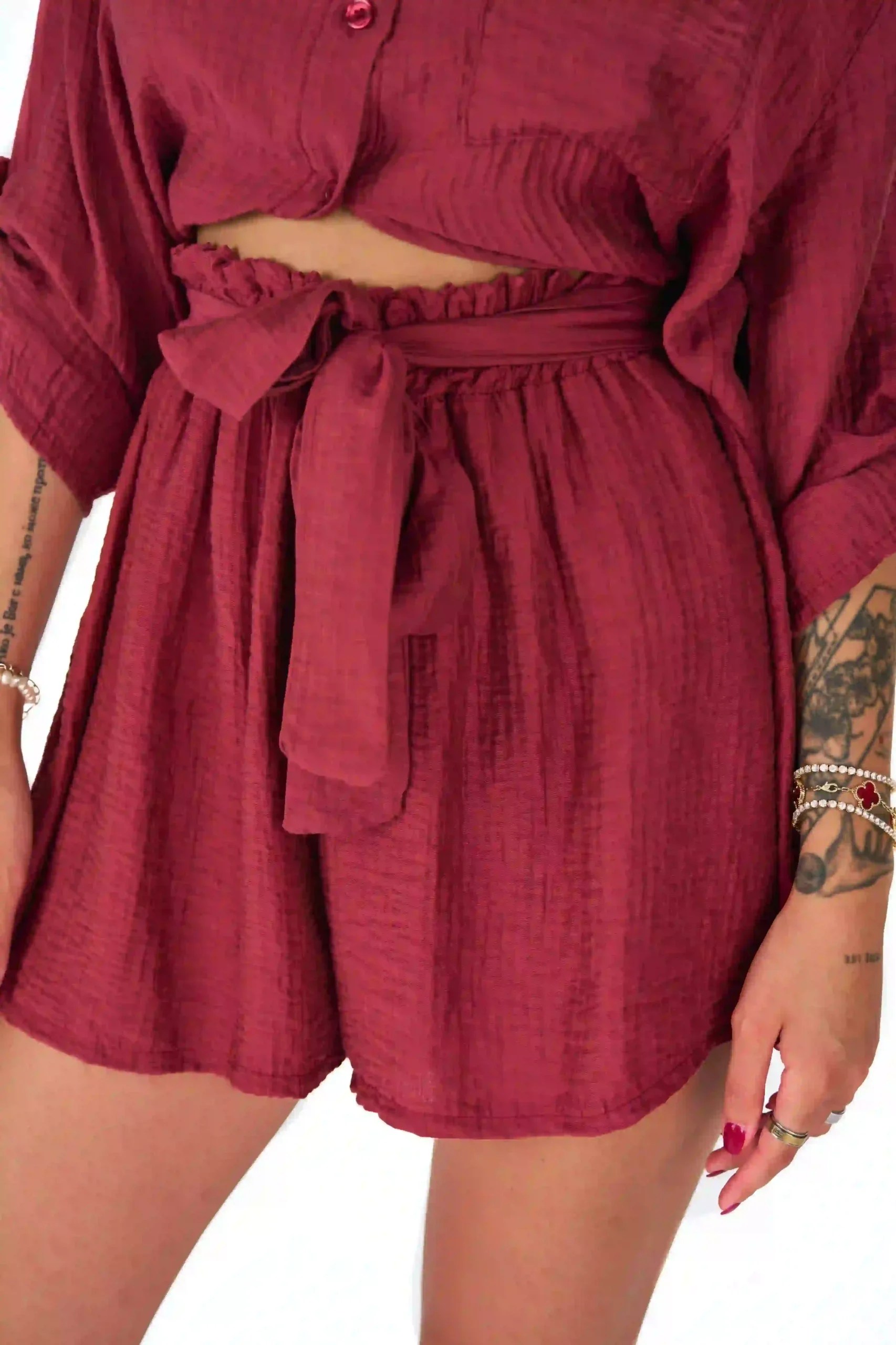 Široke lahkotne kratke hlače iz strukturirane viskozne tkanine z elastičnim in nastavljivim pasom ter stranskima žepoma za udoben in moderen videz.